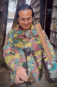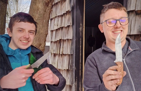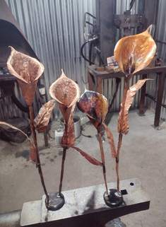 Top left, ice in the stump used to sink metal bowls. Next is Brent and his son Eli spending some quality time together making knives. Followed by a pair on hand hammered copper calla lillyies. They're fun to make and make a beautiful conversation piece. Jose stopped by and made a steel rose, also known as a rolled rose or Russian rose. The highlight of my spring so far was when my long time frienc Clark showed up and made a set of hand hammered calla lillies. How could I forget Michael & Caite.........We're off to a great start for an awesome year. Hope to see you at the forge.